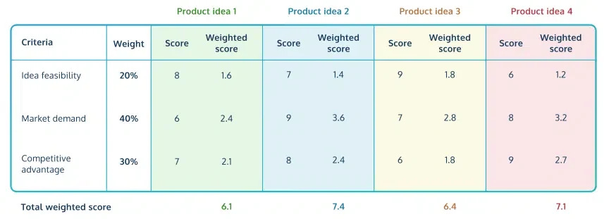 Assign Weights – Distribute weight based on importance (total = 100%) For instance, market demand might carry 40% weight, while cost might have 20%..