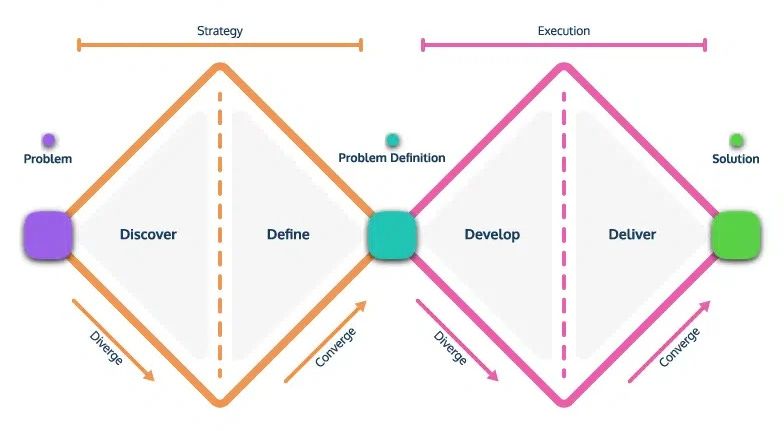 It visually represents the process with two diamonds: the first focuses on defining the problem, while the second centers on designing the solution.