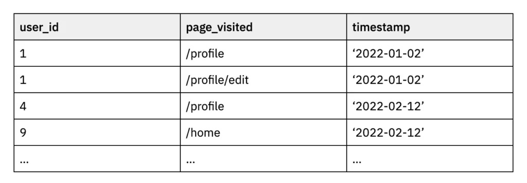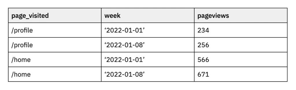 Transforming data today just means writing some SQL that takes these events and filters and aggregates them. For a concrete example, imagine we’re trying to find the most popular “page” in our product, and look at how many users visit each page on a weekly basis. The raw event data looks like this: