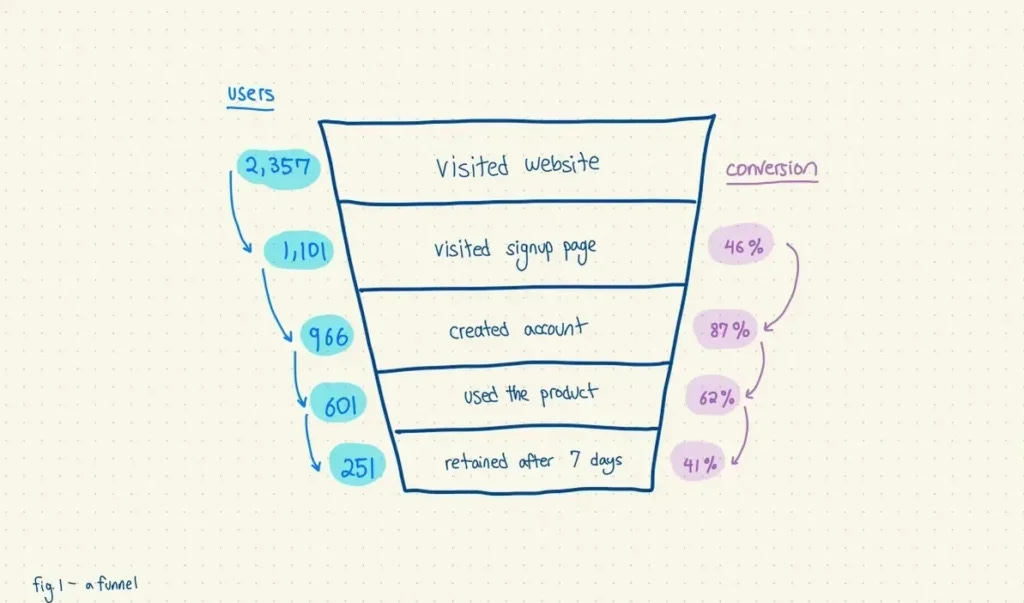 Product and growth teams like to use the concept of a funnel to visualize the paths that a user takes through the product. The funnel is wider on top – representing actions that a lot of people take, like visiting a website, and narrower on the bottom, representing actions that fewer people take, like signing up for the product and using it.