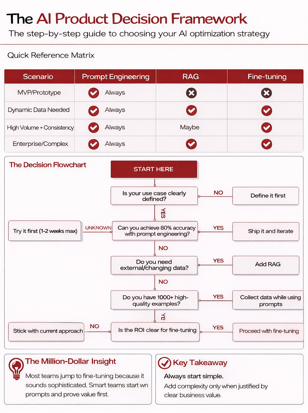 Prompt engineering is your first, best friend. Only escalate to RAG or fine-tuning when the problem genuinely demands it, and you can clearly articulate the business case for the added complexity and cost.