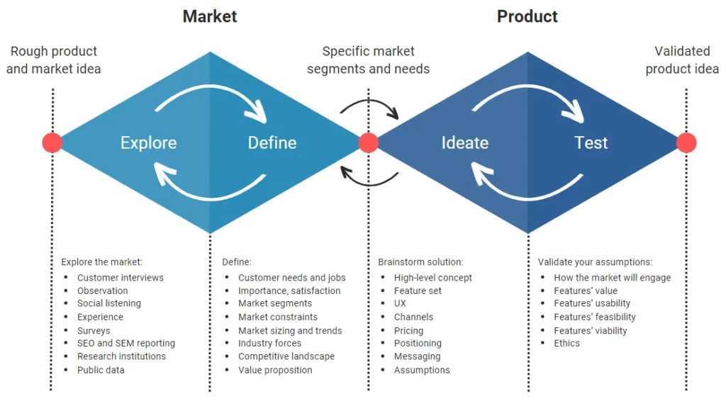 Think of Continuous Product Discovery as a series of iterative cycles, often visualized with the Double Diamond model: