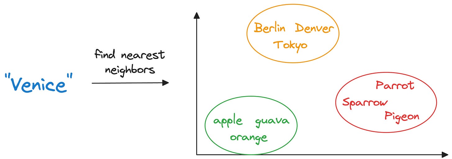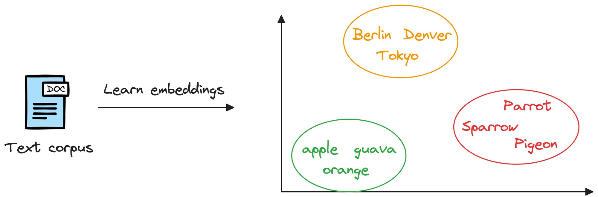 Considering word embeddings, for instance, we may discover that in the embedding space, the embeddings of fruits are found close to each other, which cities form another cluster, and so on.