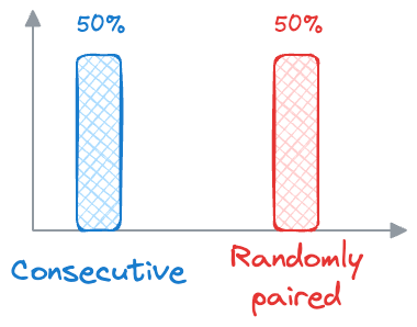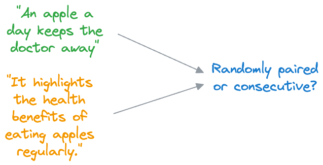 During training, BERT receives pairs of sentences as input. Half of these pairs are consecutive sentences from the same document (positive examples), and the other half are randomly paired sentences from different documents (negative examples).